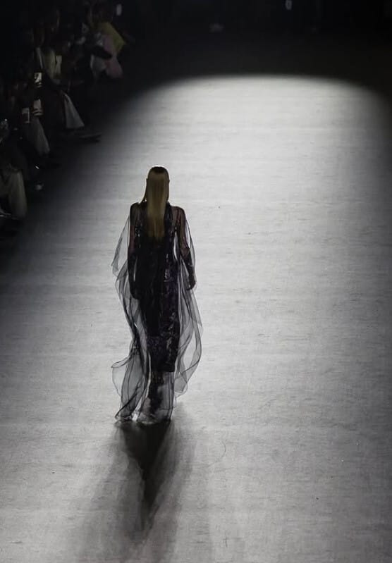 الفستان الأخير كان أجمل ختام للقصة. مصنوع من شيفون متموّج ومتطاير كأنه الموج، يعكس الضوء مثل البحر في الليل لما يضربه نور القمر