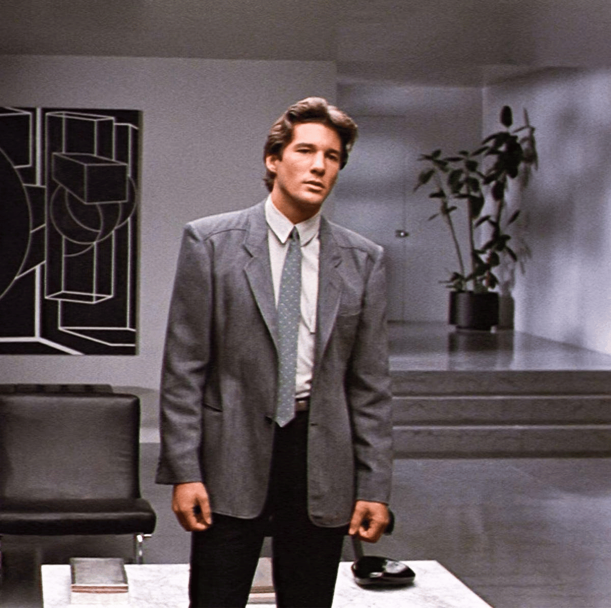 ريتشارد غير ببدلة من تصميم «جيورجيو ارماني» من فيلم «امريكان جيقلو» اصدار سنة ١٩٨٠